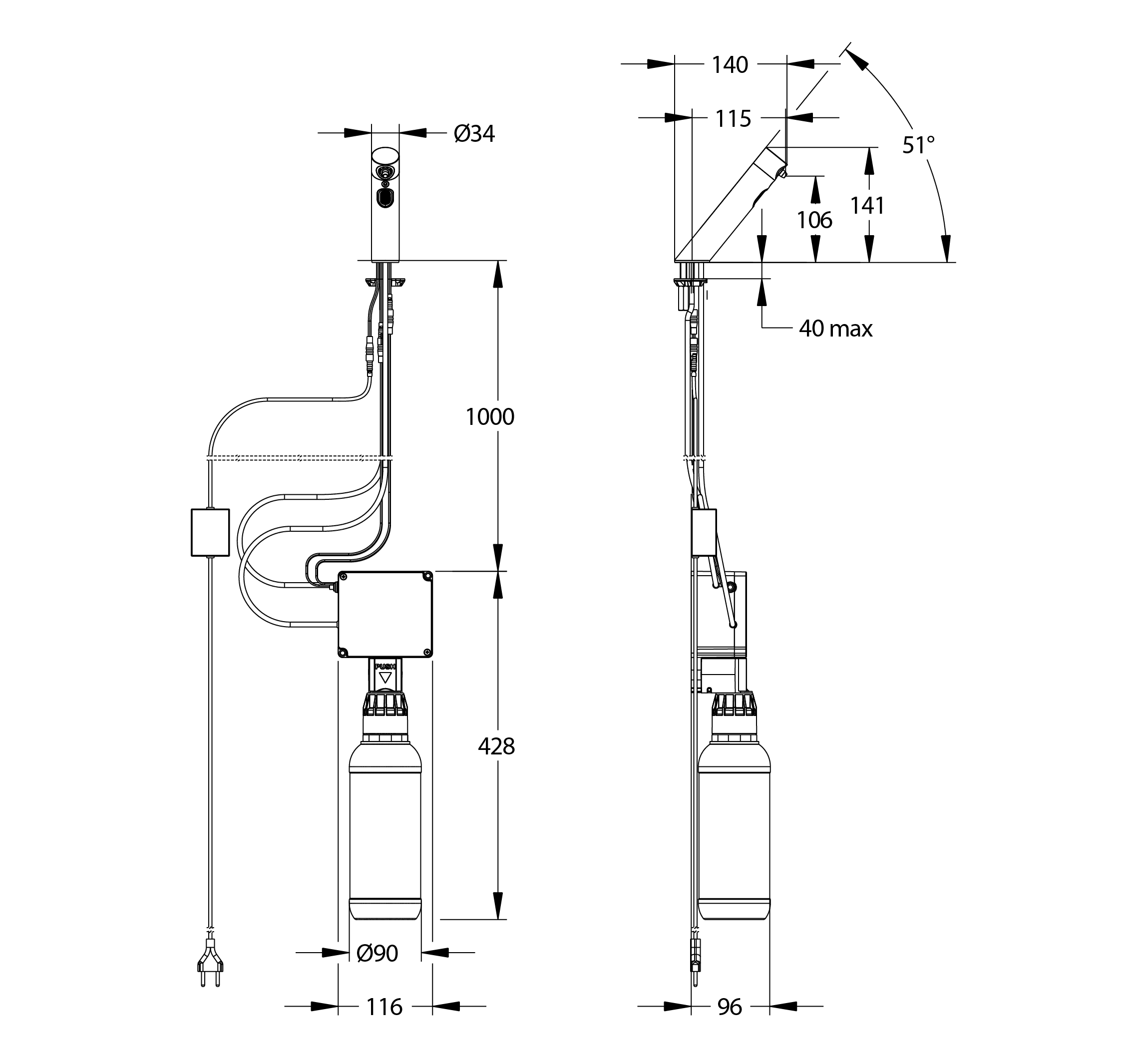Recommended installation height at least 30 cm from the bottom of the basin